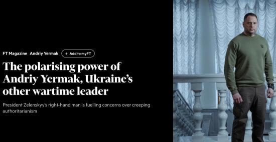 Financial Times пишет, что глава Офиса президента "часто действует как президент", обладает возможно даже большим влиянием чем Зеленский, "разрабатывает мирные планы, руководит неофициальной дипломатией и лично назначает чиновников", "премьер-министр и высшее военное командование часто подчиняются ему".