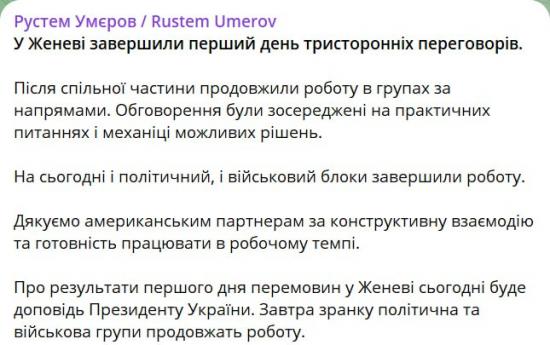 «В Женеве завершился первый день трехсторонних переговоров. После совместной части продолжили работу в группах по направлениям. Обсуждения были сосредоточены на практических вопросах и механике возможных решений. На сегодняшний день и политический, и военный блоки завершили работу. Благодарим американских партнеров за конструктивное взаимодействие и готовность работать в рабочем темпе. О результатах первого дня переговоров в Женеве будет доклад президенту Украины. Завтра с утра политическая и военная группы продолжат работу», – написал он.
