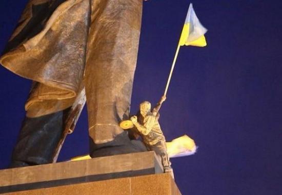 Несколько сотен активистов, принимавших участие в акции «Харьков – это Украина», после шествия пришли на площадь Свободы с целью снести памятник Ленину.