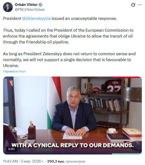 Таким образом, сегодня я призвал председателя Европейской комиссии обеспечить выполнение соглашений, обязывающих Украину разрешить транзит нефти по нефтепроводу «Дружба». Пока президент Зеленский не вернется к здравому смыслу и нормальной жизни, мы не поддержим ни одного решения, благоприятного для Украины», – заявил Орбан в Х.