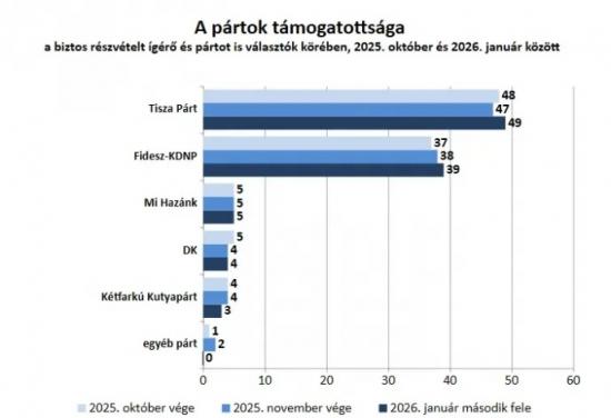 Опрос общественного мнения, который провела компания «Zavecz Research» с 19 по 24 января, показал, что «Тиса» увеличила поддержку с 47% в ноябре до 49% в январе.