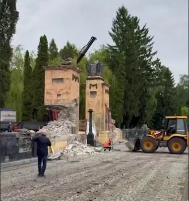 Во Львове демонтируют монумент на Холме Славы, спецтехника сносит колонны на входе, началась эксгумация останков советских солдат