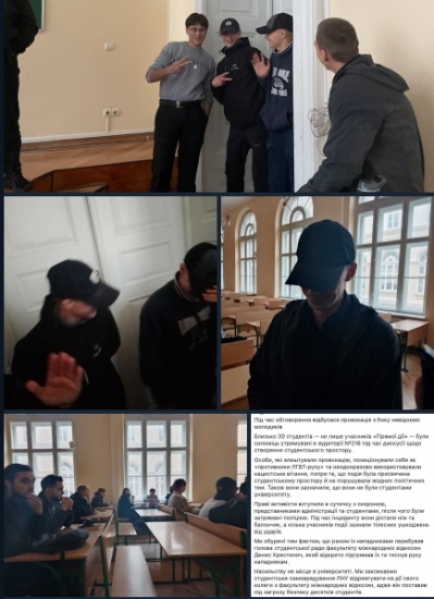 Сообщается, что лица, устроившие провокацию, позиционировали себя как «противники ЛГБТ-движения» и неоднократно использовали нацистское приветствие, заблокировали в аудитории около 30 студентов, которые проводили мероприятие, посвященное «студенческому пространству».
