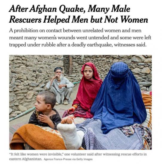New York Times сообщает, что из-за строгих норм "Талибана", запрещающих любой физический контакт между мужчинами и женщинами не являющимися членами семьи, спасатели игнорировали женщин оказавшихся под завалами.