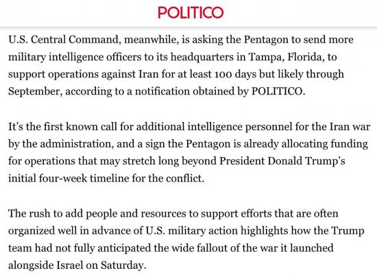 Как отмечает Politico, это первый известный запрос администрации на расширение разведывательного персонала в связи с войной против Ирана. То есть, операция может продолжаться значительно дольше первоначально озвученного Трампом четырехнедельного срока.