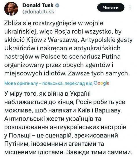 «Развязка украинской войны близка, поэтому Россия делает всё, чтобы поссорить Киев с Варшавой. Антипольские жесты украинцев и нагнетание антиукраинских настроений в Польше — это сценарий Путина, организованный иностранными агентами и местными глупцами.