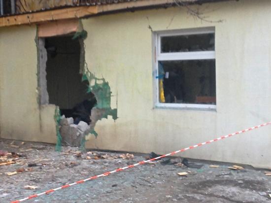 Разрушена стена пристройки, в которой и находился магазин. Также сильно поврежден стоявший рядом легковой автомобиль, в доме рядом взрывной волной выбиты окна в квартирах жильцов и упали буквы вывески стоматологического кабинета.