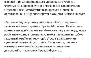 Известный философ Фрэнсис Фукуяма во время ежегодной встречи Ялтинской европейской стратегии (YES) заявил, что исход войны России против Украины будет иметь решающее значение не только для соседних стран в регионе, но и для всего мира.