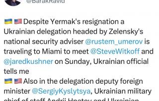 Украинская делегация во главе секретарём СНБО Умеровым отправляется в Майами на встречу со Уиткоффом и Кушнером, которая состоится в воскресенье