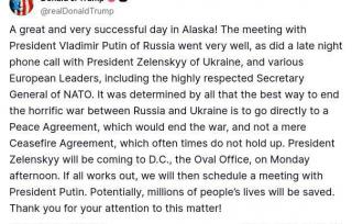 «Отличный и очень успешный день на Аляске! Встреча с президентом России Владимиром Путиным прошла очень хорошо, как и поздний ночной телефонный разговор с президентом Украины Зеленским и различными европейскими лидерами, включая...