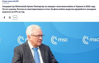 Об этом заявил гендиректор немецкого военного концерна Rheinmetall Армин Паппергер.
