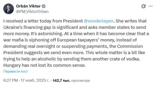 Вся эта история немного похожа на попытку помочь алкоголику, отправив ему ещё один ящик водки. Венгрия не утратила здравого смысла», – написал Орбан в Х.
