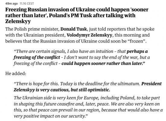 «Есть определенные сигналы, у меня также есть интуиция, что, возможно, замораживание конфликта — я не хочу говорить о конце войны, но о замораживании конфликта — может произойти скорее раньше, чем позже. Есть надежда на это. Сегодня истекает срок ультиматума.