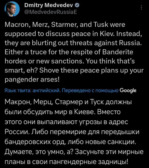Вместо этого они выпаливают угрозы в адрес России. Либо перемирие для передышки бандеровских орд, либо новые санкции", - написал Медведев и предложил "засунуть эти мирные планы в свои пангендерные задницы".