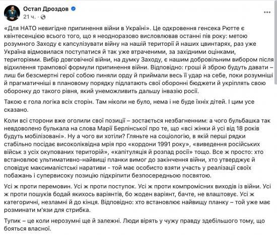Об этом написал в Facebook журналист Остап Дроздов, комментируя заявление генсека НАТО Рютте, где тот дает понять, что странам альянса невыгодно завершение конфликта.
