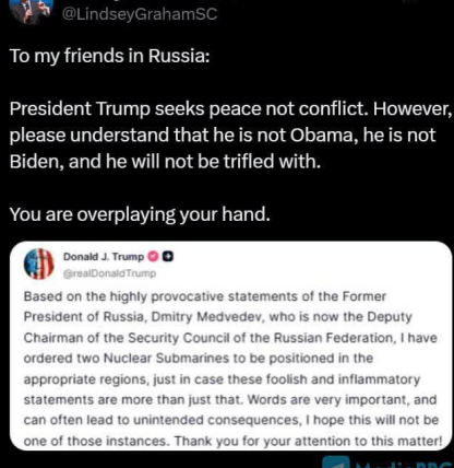 «Моим друзьям в России: президент Трамп стремится к миру, а не к конфликту. Однако, пожалуйста, поймите, что он не Обама, не Байден, и с ним шутки плохи. Вы переоцениваете свои возможности», - написал Грэм.