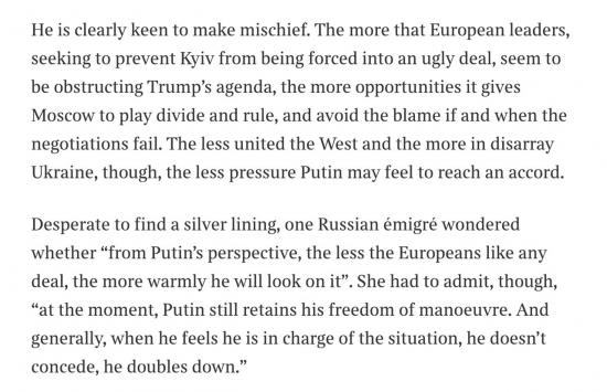 «Чем больше европейские лидеры, пытаясь не допустить принуждения Киева к некрасивой сделке, кажется, препятствуют повестке Трампа, тем больше это даёт Москве возможностей играть в принцип «разделяй и властвуй» и избегать обвинений, если переговоры провалятся», - пишет Галеотти.