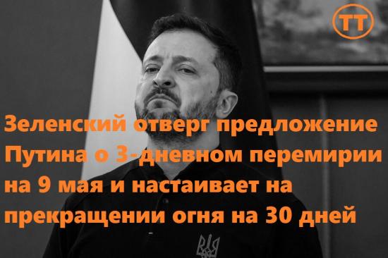 Зеленский отверг предложение Путина о 3-дневном перемирии на 9 мая и настаивает на прекращении огня на 30 дней, - Интерфакс-Украина
