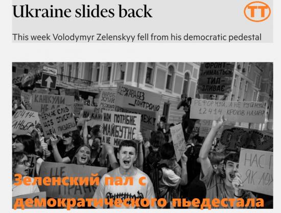 «Смелое и стойкое лидерство Зеленского в борьбе Украины с российской тиранией поставило его на пьедестал демократии. На этой неделе он с него пал», - заключает издание.