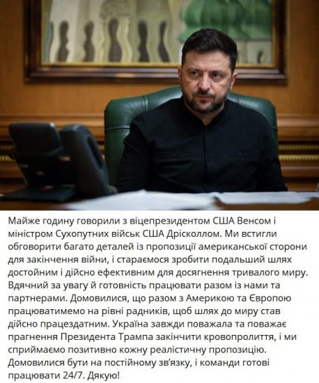 Мы успели обсудить многие детали предложения американской стороны по окончанию войны и стараемся сделать дальнейший путь достойным и действительно эффективным для достижения прочного мира. Благодарен за внимание и готовность работать вместе с нами и партнерами. Договорились, что вместе с Америкой и Европой будем работать на уровне советников, чтобы путь к миру стал действительно работоспособным. Украина всегда уважала и уважает стремление президента Трампа положить конец кровопролитию, и мы позитивно воспринимаем каждое реалистичное предложение.