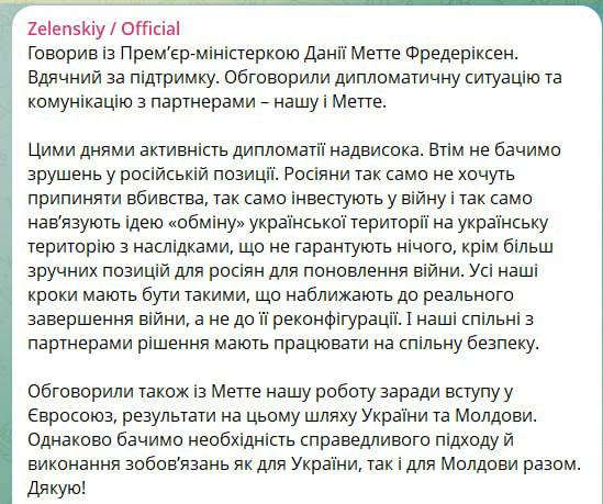 "Не видим сдвигов в российской позиции. Россияне всё так же не хотят останавливать убийства, всё так же инвестируют в войну, всё так же навязывают идею "обмена" украинской территории на украинскую территорию с последствиями, которые не гарантируют ничего, кроме более удобных позиций для россиян для возобновления войны", - написал он в своем телеграмм-канале по итогам разговора с премьер-министром Дании Фредериксен.