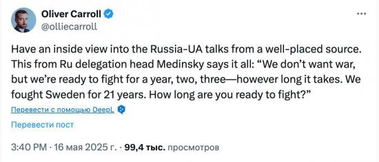 Журналист The Economist Оливер Кэррол сообщает, что Мединский задал такой вопрос на переговорах украинской делегации: «мы не хотим войны, но готовы воевать ещё год, два, три - столько, сколько потребуется. Мы воевали со Швецией 21 год. А вы сколько готовы воевать?»