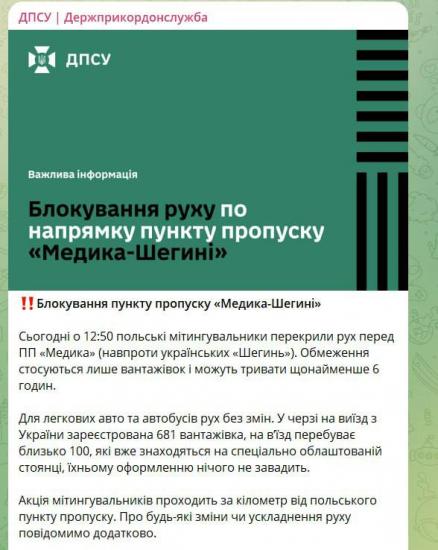 По заявлению службы, поляки перекрыли пункт пропуска "Медика-Шегини".