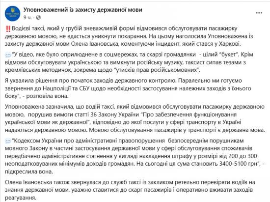 Она написала, что водитель, который откажется обслуживать клиента на украинском, будет оштрафован на 3400-5100 грн.