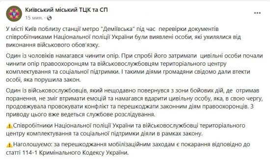 В сообщении ТЦК в Фейсбуке говорится, что возле станции метро «Демеевская» во время проверки документов сотрудники полиции обнаружили «уклоняющихся от исполнения воинского долга лиц».
